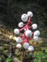 Doll’s Eyes, or White Baneberry, has deeply ribbed foliage and white, frothy clusters of fragrant flowers that bloom throughout May and June.  Pea-sized fruits develop in late summer and mature throughout early fall, often lasting until the first frost.  The berries extend from the stem on thick stalks which turn a vivid red, providing stark contrast to the bone china-white fruits.  The flower stigmas form a dark dot at the outer end of the berries, making them look like eyes, similar to the porcelain eyes used in dolls.