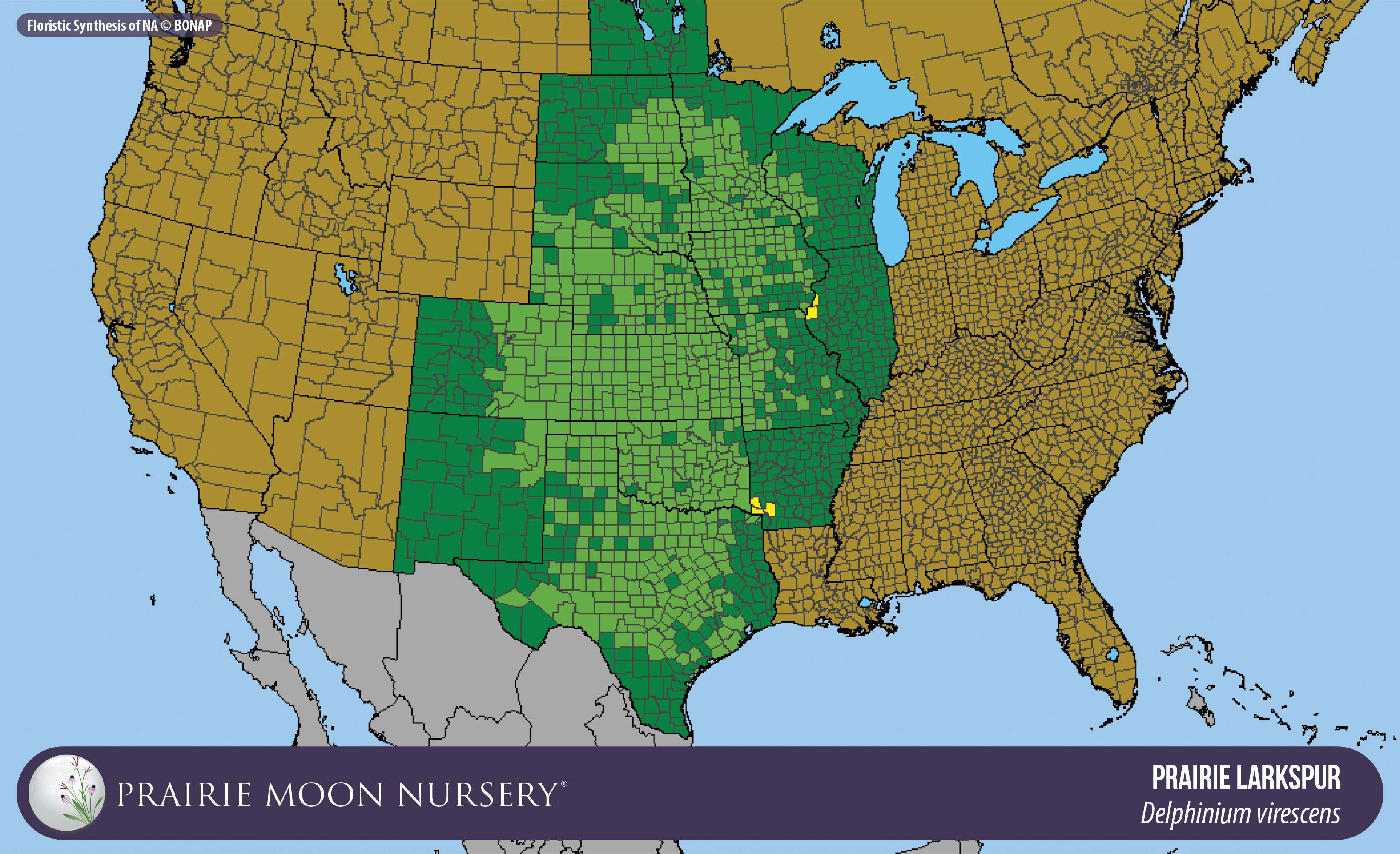 Prairie Larkspur can be found in the Great Plains corridor, and in Southeastern and Southern states. Delphinium virescens is considered a subspecies of D. carolinianum (Wild Blue Larkspur) so can also be called Delphinium carolinianum ssp. virescens. Prairie Larkspur is usually white whereas Wild Blue Larkspur is usually blue.