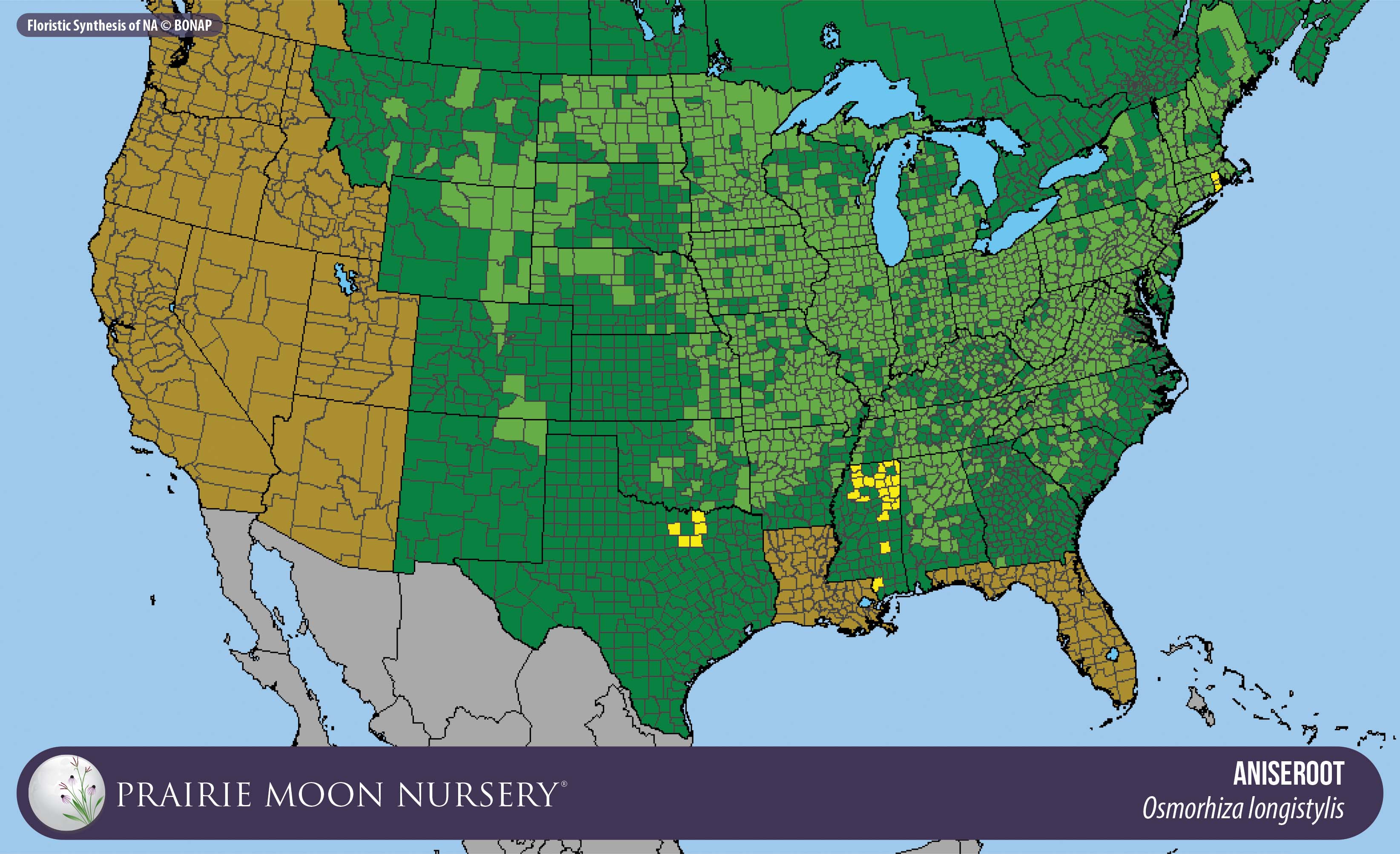 This map shows the native and introduced (adventive) range of this species. Given appropriate habitat and climate, native plants can be grown outside their range.