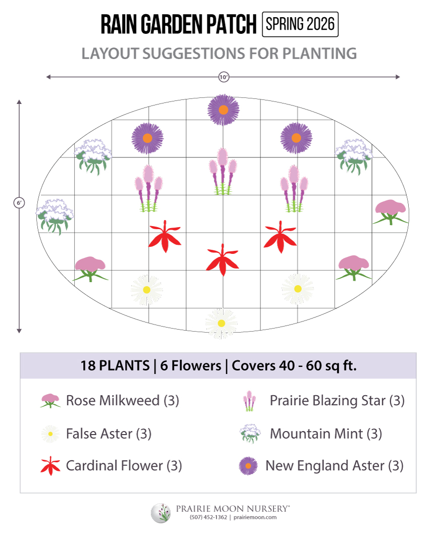 This new 18 plant kit is a smaller version of our Rain Garden Kit for Pollinators. Deep-rooted natives excel at reducing water runnoff and filtering out pollutants. Some of the most popular wetter plants like Cardinal Flower, Blazing Star, and Rose Milkweed take center stage mid-summer, attracting butterflies and hummingbirds to their tall blooms. Fragrant foliage and flowers of Mountain Mint bring in the bumble bees. A burst of white and purple from False Aster and New England Aster round out the fall season.