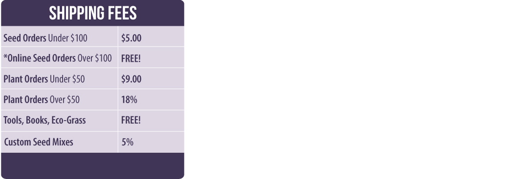 *Free shipping on $100+ seed orders is for online, retail orders. Phone orders, custom seed mixes, or discounted seed sales over $100, add 5% of the total seed cost.