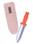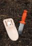 The Italian-made knife is from the highest quality Swedish stainless steel. The rust-resistant blade's features include one-inch increments stamped along its 6” length for quick measurements, a serrated edge for cutting through roots and other tough plant material, a sturdy tip for surgical weed removal and a notch for cutting twine or string that can double as a bottle-opener when in-field liquid fortification is needed. The comfortable composite handle is a bright orange to be easily seen when left behind. It’s as sturdy as the leather sheath so you can expect years of service from the soil knife. *This very sharp tool demands caution!