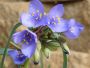 Its unusual blue-green soft foliage and tendency to bloom in the morning sun and close from mid-day heat make this an attractive addition wherever it is found. A stand of Spiderworts can be in bloom from May through July due to this afternoon closing habit. Foliage becomes stressed and yellow/brown after bloom so it can be cut back after seeding. It grows very well in part shade but blooms may be less.